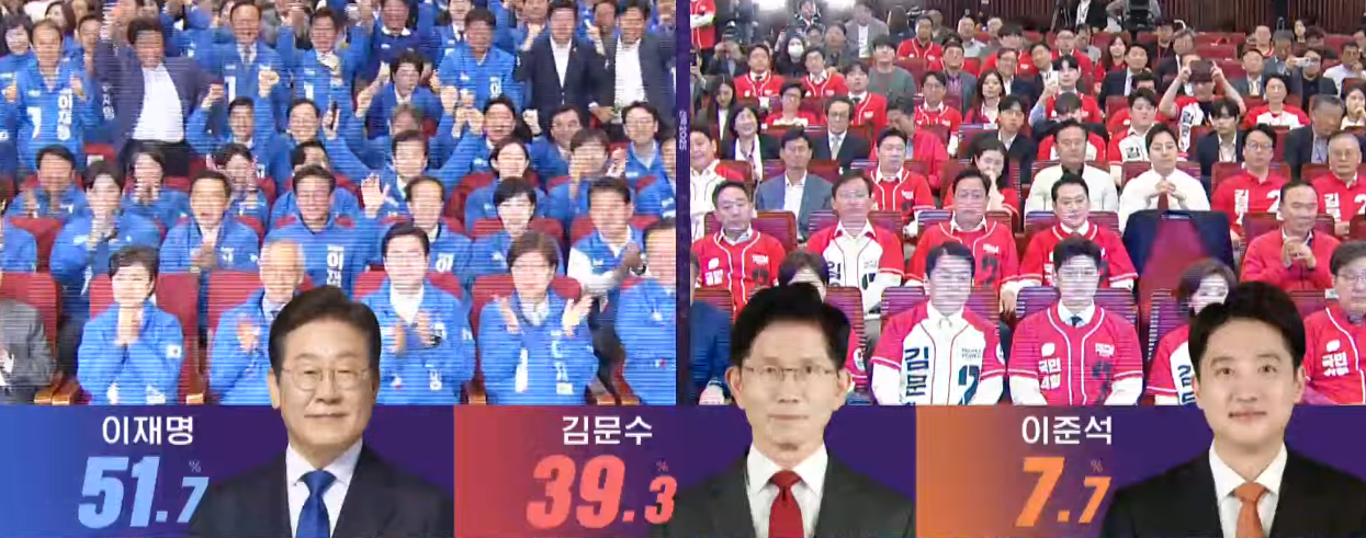 2025년 대통령 선거 출구조사에서 과반 득표를 기록하며 유력한 당선자로 떠오른 이재명 더불어민주당 후보.