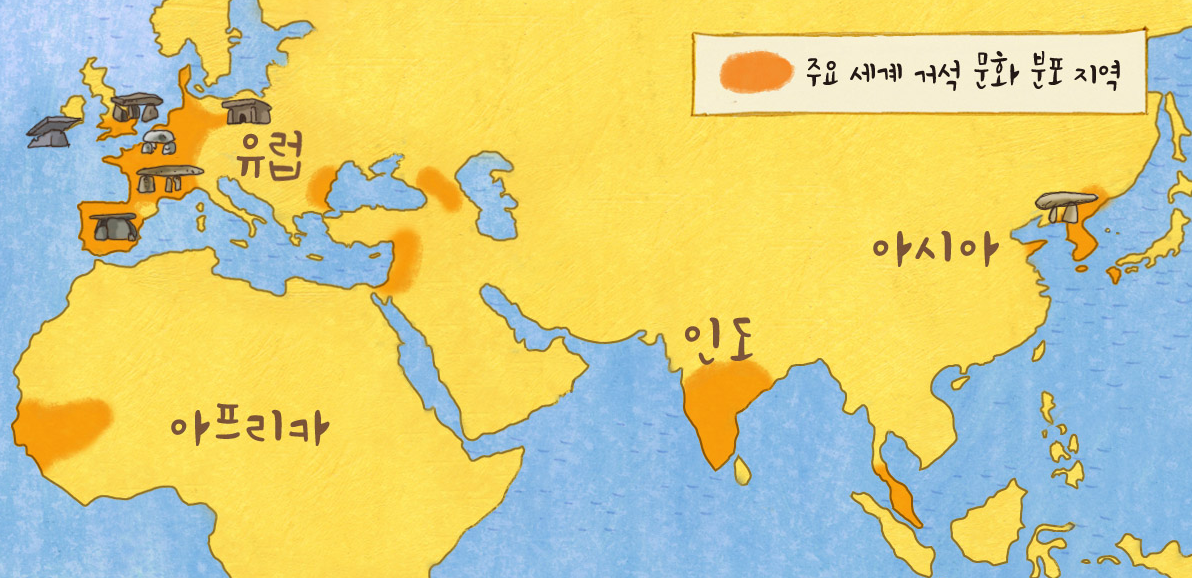 - 고인돌은 아시아, 유럽, 아프리카 등 전 세계적으로 분포되어 있습니다. 특히 한반도에는 약 3만여 기의 고인돌이 발견되었으며, 이는 세계 고인돌의 약 40%에 달하는 숫자입니다.
